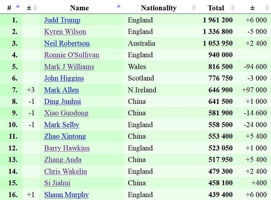 一场9-8,斯诺克最新排名出炉:中国5人TOP16,丁俊晖仍是一哥